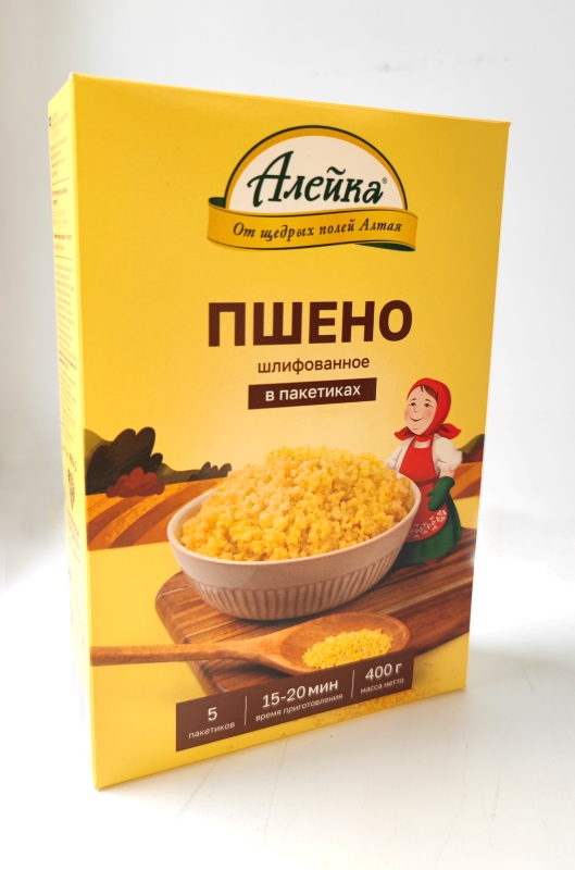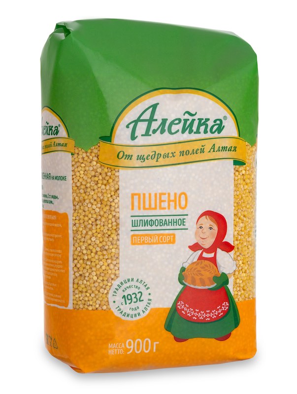 Крупа пшено шлифованное ТМ «Алейка» вырабатывается из проса крупяного путем освобождения его от цветочных пленок, плодовых, семенных оболочек и зародыша. Природный ярко-желтый цвет, однородность зерен и отсутствие сорных примесей обеспечивают высокие потребительские свойства пшена «Алейка».
