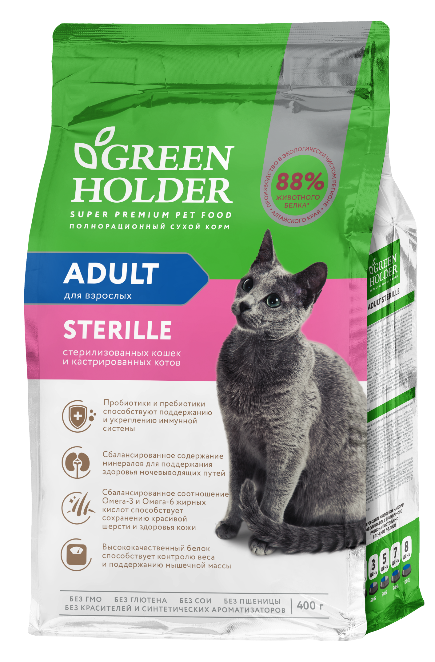 Green Holder ADULT STERILE is formulated to meet the needs of sterilized cats and contains all the necessary nutrients to maintain vitality and urinary tract health. The product is rich in high-quality animal protein, which helps your pet to maintain good physical shape. In addition, slow-fermenting dietary vegetable fibres and a moderate fat content aid in preserving the ideal weight and muscle mass of the pet. An optimal ratio of omega-3 and omega-6 fatty acids helps to improve coat condition and maintain healthy skin. Probiotics and prebiotics normalize the function of the gastrointestinal microflora, improve bowel motility, optimize digestion and boost the immune system. An optimally selected complex of minerals in the feed helps to maintain the health of the urinary tract. The product formula incorporates chondroprotective agents to strengthen and maintain the health of joints and ligaments.