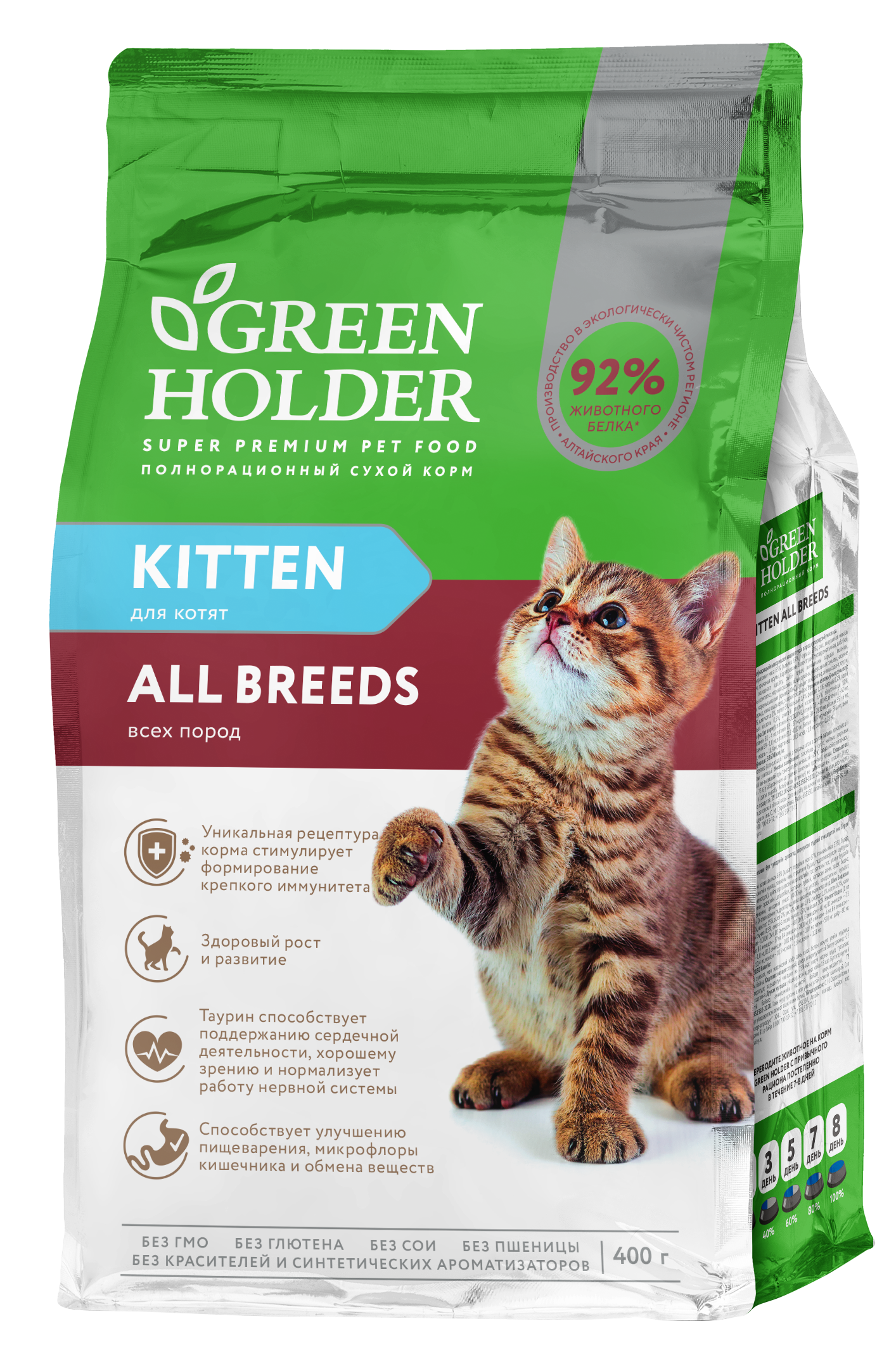 Green Holder KITTEN ALL BREEDS is specially formulated to provide the growing body with all the nutrients necessary for proper development during the period of active growth. This feed is also suitable for pregnant and lactating cats. The increased levels of nutrients, essential vitamins and minerals fully meet their physiological needs. The fats and an optimal balance of omega-3 and omega-6 fatty acids in the product help to improve coat condition and maintain healthy skin. Probiotics and prebiotics normalize the function of the gastrointestinal microflora, improve bowel motility, optimize digestion and boost the immune system. An optimal balance of calcium and phosphorus ensures skeletal