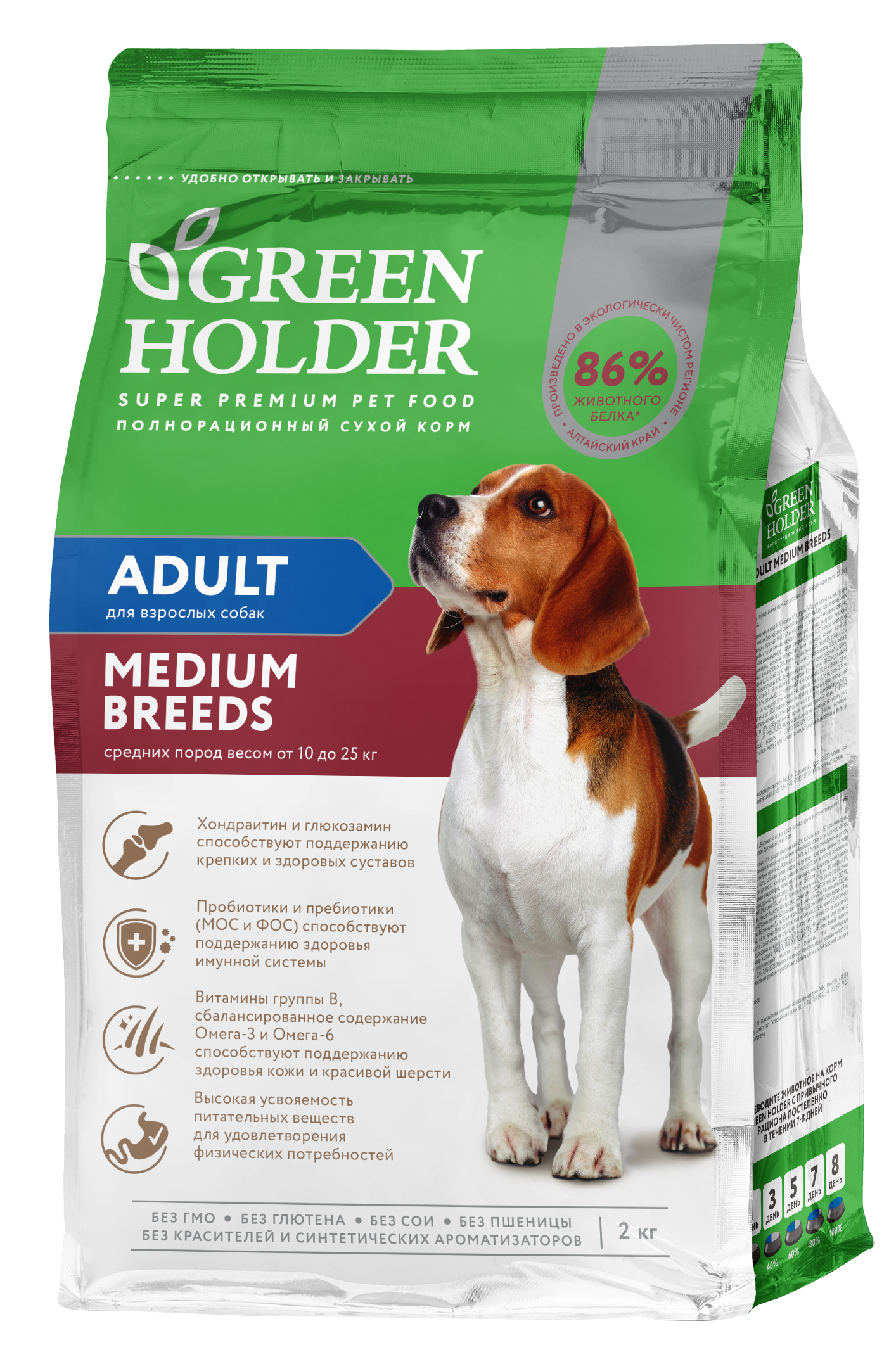 Green Holder ADULT MEDIUM BREEDS is rich in animal protein, which helps your pet to maintain good physical shape. In addition, the fats and fatty acids in the product help to improve your pet's coat and skin health. Probiotics and prebiotics normalize the function of the gastrointestinal microflora, improve bowel motility, optimize digestion and boost the immune system. Medium breed dogs have a high level of motor activity, so this feed is enriched with glucosamine/chondroitin complex for joint health.